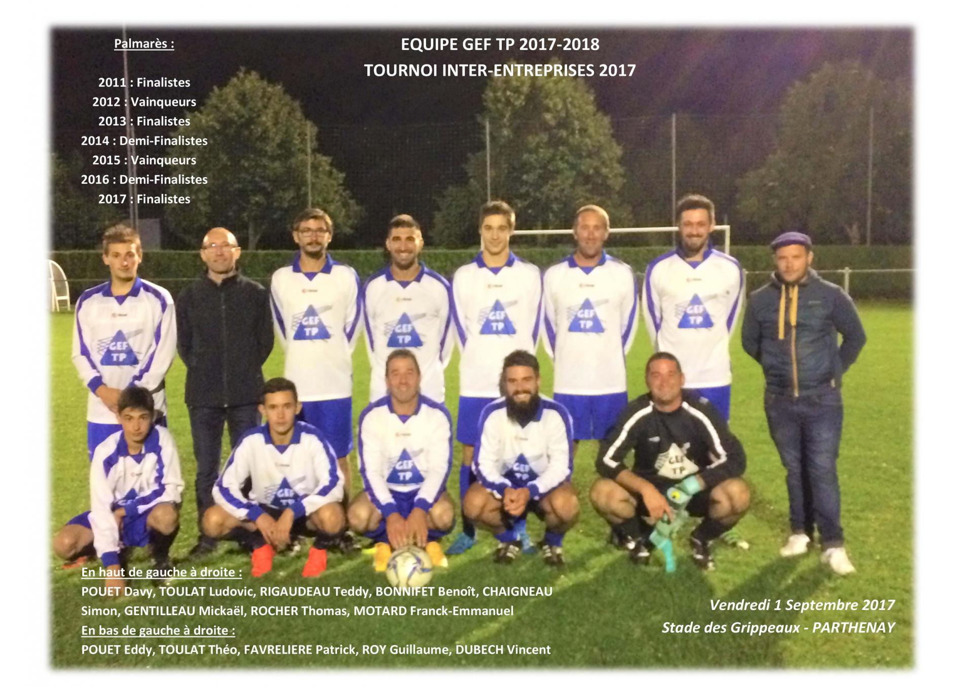 Voici une photo datant de 2017 du tournoi annuel inter-entreprise de Parthenay. Tous les bénéfices et inscriptions de ce tournoi sont reversés à une association caritative qui change tous les ans. On retrouve sur cette image l'historique de participation de l'équipe à ce tournoi.